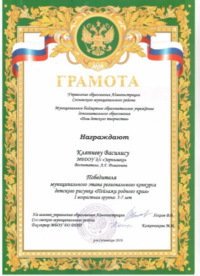 Поздравляем воспитанницу группы "Букварёнок" Кляпнёву Василису с победой в муниципальном этапе регионального конкурса детского рисунка "Пейзажи родного края"! Так держать!